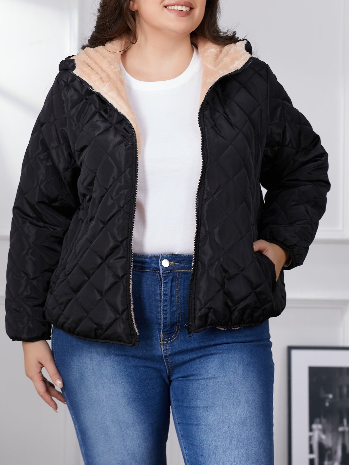 Diese Damen-Jacke ist in Schwarz gestaltet und verfügt über lange Ärmel. Das Design zeigt eine gerade, strukturierte Silhouette mit klaren Linien. Die Jacke kann einfach mit Hosen, Jeans oder Stiefeln kombiniert werden, um einen abgestimmten Winterlook zu erstellen.